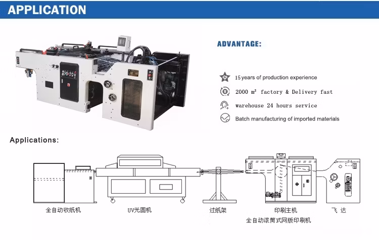 Auto swing cylinder screen printing machine series is a well-recognized auto flat screen press with high speed and high precision, ranking top in China suppliers.It is advantageous for well designed structure with single piece or streamline paper feeding equipment.Frequency variance control motor and whole-process auto close-monitoring device are equipped. It can be controlled by PLC program Panel or centralized controller.Only one person is necessary for operation, which greatly saves labor and boosts production. This machine can be used in printing soft and semi-soft material featured of 100-350 g/m2,especially with UV ink for colors such as golden and silvery of Ceramics sticker,Package,Label and Cards, and etc. It's vivid colors, stereoscopic effect and strong covering achieves a superior positions over other print presses.